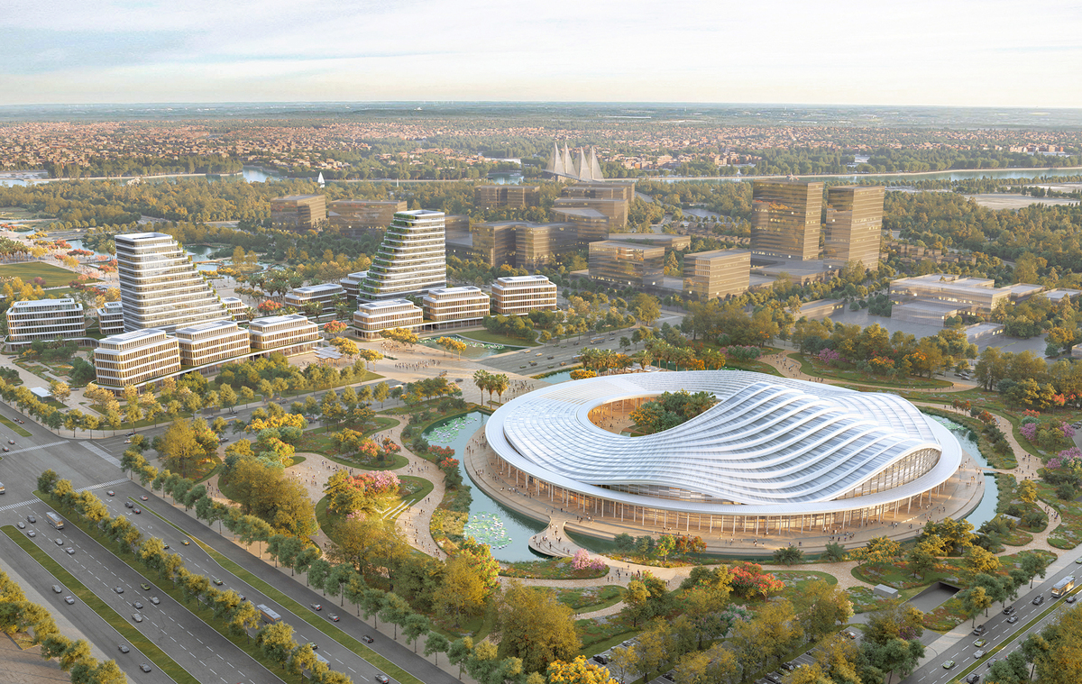 Phối cảnh tổng thể Dự án đầu tư xây dựng công trình Trung tâm Hội nghị - Biểu diễn thành phố và hệ thống hạ tầng kỹ thuật đồng bộ tại Khu đô thị Bắc sông Cấm.