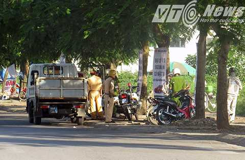 Cách đó khảng 150m đường đi Cầu Rào 2, lại có một chốt đang ‘tuýt còi’ 3 xe container chở hàng hóa, sắt thép. Một chốt CSGT, trật tự khác cũng thuộc Công an quận Lê Chân thì đang làm nhiệm vụ dưới vỉa hè, nơi có bóng mát của hàng cây ven đường.