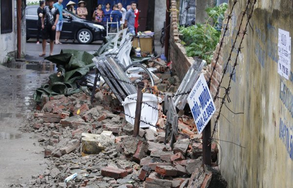Khoảng 10h ngày 13/6, sau khi trời nổi mưa dông, bức tường bao dài khoảng 50 m của trường Khiếm thính Hải Phòng (số 32, Nguyễn Thị Thuận, phường Cát Bi, quận Hải An, TP Hải Phòng) bất ngờ đổ sập.