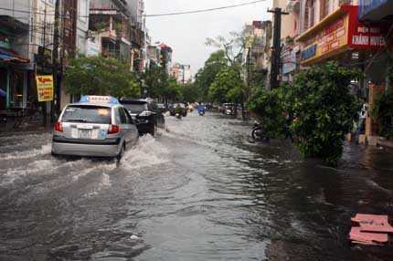 Đường Lê Lai có chỗ ngập 25cm, khi xe ôtô, container chạy qua nước hắt tung lên người đi đường
