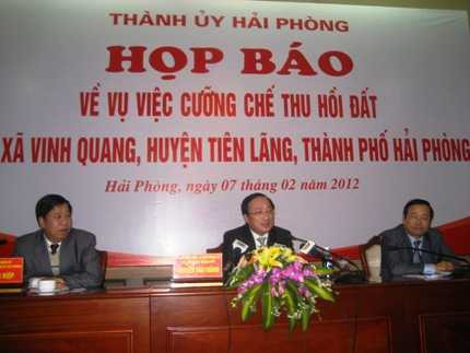 Chiều nay (7/2), Bí thư thành ủy Hải Phòng Nguyễn Văn Thành đã tổ chức họp báo công khai thông báo về vụ cưỡng chế đất của gia đình ông Đoàn Văn Vươn.