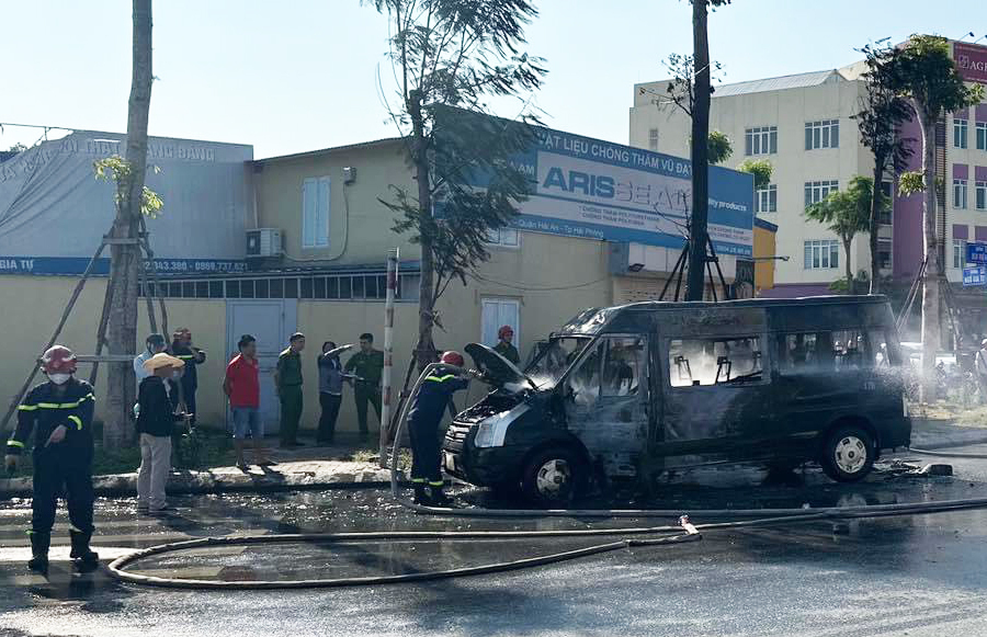 Chiếc xe 16 chỗ tự bốc cháy, vụ việc không có thiệt hại về người. (Ảnh: Page Hải Phòng)