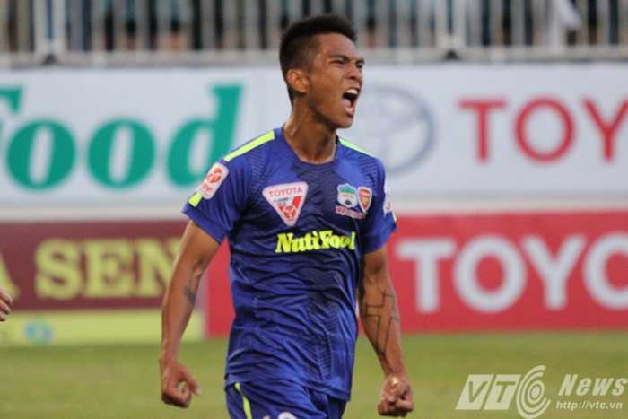 | Hoàng Thiên ăn mừng bàn thắng vào lưới Thanh Hóa |