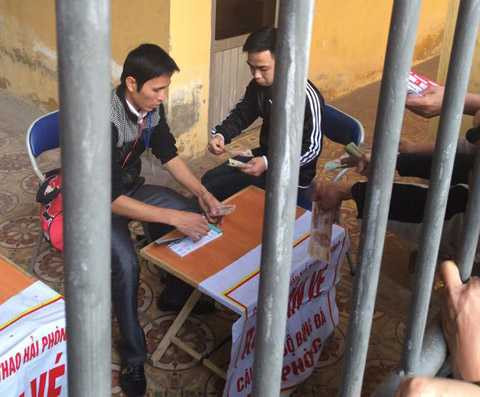 Phải tới buổi chiều, quầy bán vé ở sân Lạch Tray mới mở cửa. Tuy nhiên cách thức bán vé qua cửa sắt của BTC sân đã gây nhiều khó khăn cho người hâm mộ.