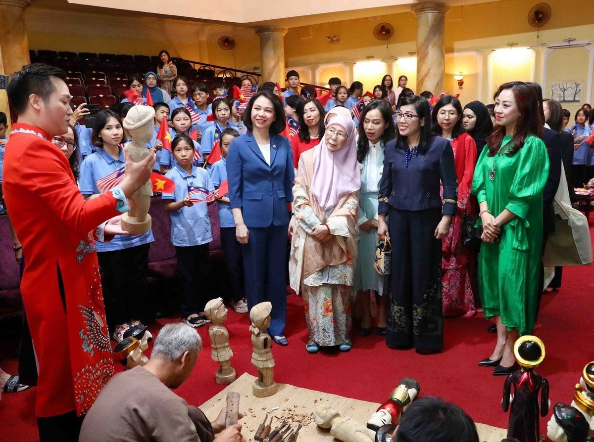 Phu nhân Thủ tướng Việt Nam Lê Thị Bích Trân và Phu nhân Thủ tướng Malaysia Dato' Seri Dr. Wan Azizah binti Dr. Wan Ismail nghe giới thiệu công việc tạo hình quân rối nước của các nghệ nhân. (Ảnh: Phạm Kiên/TTXVN)