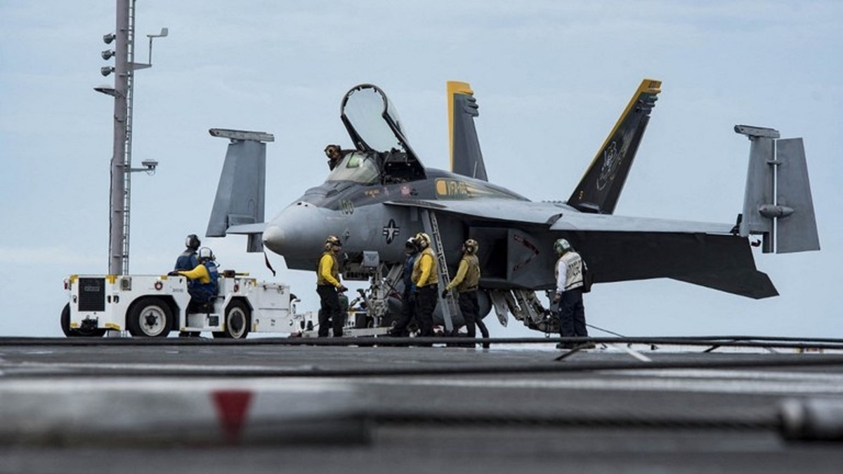 Một máy bay chiến đấu F/A-18E Super Hornet trên sàn đáp của tàu sân bay USS Dwight D. Eisenhower. (Ảnh: RT)