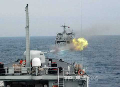 | Tàu chiến hải quân Trung Quốc bắn đạn thật - Ảnh: Chinamil |
