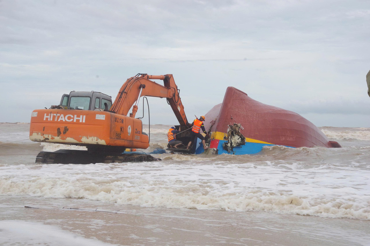 Tàu cá BV92756TS (1 trong 2 chiếc tàu gặp nạn) được phát hiện trôi dạt, lật úp ở vùng biển thôn Thanh Hải (xã Bắc Trạch, tỉnh Quảng Trị) đang được lực lượng chức năng trục vớt. (Ảnh: Hoàng Cuối)