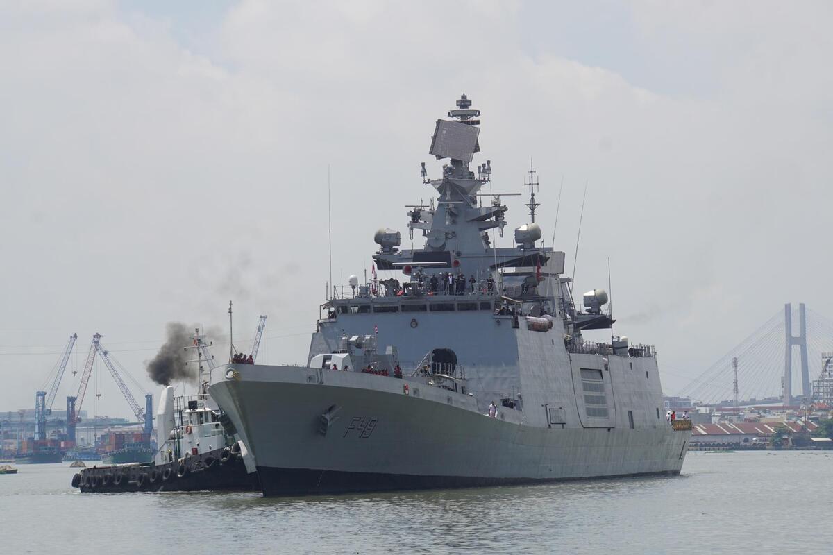 Khinh hạm INS Sahyadri cập cảng Nhà Rồng vào sáng 24/6. (Ảnh: Trần Hoàng)