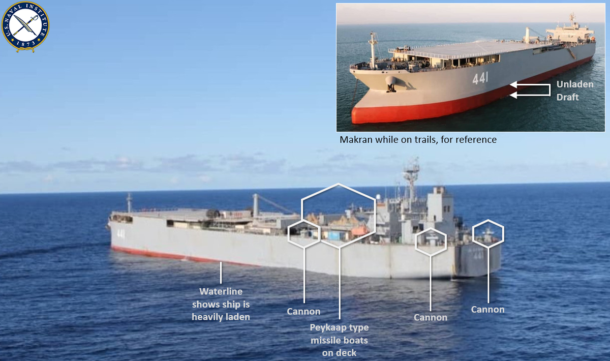 Theo Drive, Makran được gọi là "tàu căn cứ tiền phương”, được nâng cấp từ một tàu chở dầu cỡ lớn, có kích thước và khả năng tương đồng với các căn cứ viễn chinh di động của Mỹ. Tàu dài 230m, có khả năng vận hành cùng lúc từ 6 đến 7 trực thăng.