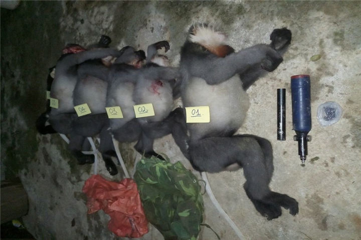 Khi thấy tổ công tác liên ngành tuần tra, hai đối tượng tháo chạy và để lại hiện trường 5 con voọc chà vá chân xám đã chết, 1 xe máy, 1 bình hơi, 53 viên đạn chì, 1 ống giảm thanh.