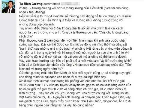 Còn trên một trang facebook lớn khác, hình ảnh Tiến Minh gượng gạo nhận thưởng đã được kèm thêm bình luận: “Tiến Minh đã thi đấu hết mình và để nhận được thế này hả?”