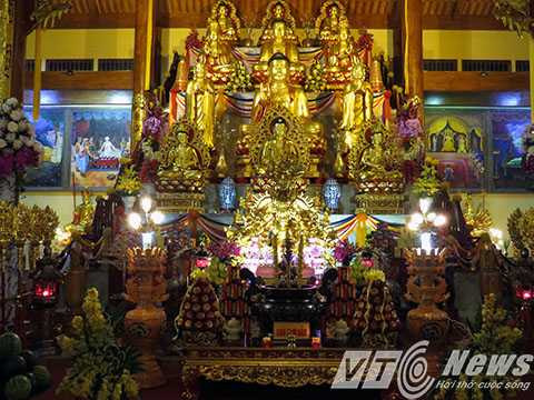 | Chính điện ngôi Đại Hùng Bảo Điện, gian thờ tự chùa Ba Vàng với vẻ đẹp rực rỡ nguy nga được bài trí theo mô thức thờ tự truyền thống của những ngôi danh lam cổ tự miền Bắc nhưng gọn gàng và thông thoáng hơn. |