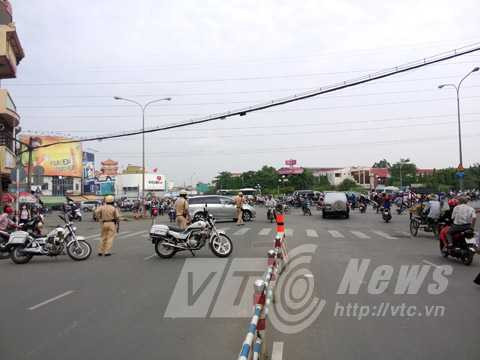| Tại ngã tư đèn đỏ Nguyễn Văn Luông - Hậu Giang (Q.6), lực lượng bảo vệ dân phố, dân quân tự vệ, CSGT Q.6 phong tỏa hiện trường. Ảnh: Huy Phan |