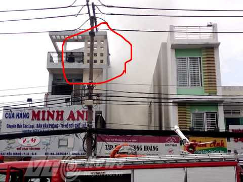 | Các chiến sỹ PCCC leo lên tầng cao nhà kế bên (vòng đỏ) để phun nước xuống căn hộ bị hỏa hoạn. Ảnh: Huy Phan |