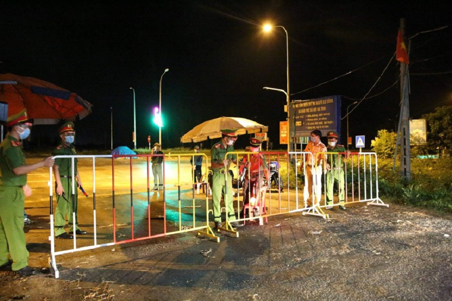 Lực lượng chức năng phong tỏa khu vực ca dương tính SARS-CoV-2 sinh sống. (Ảnh: T.H)