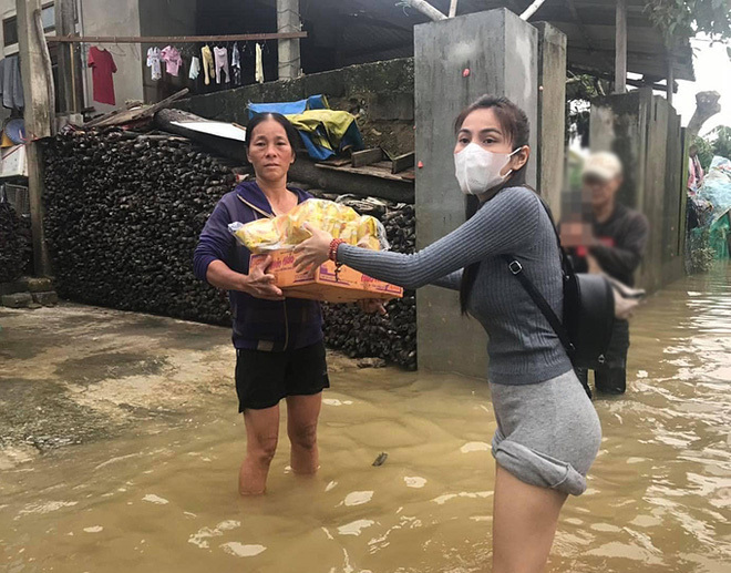 Ca sĩ Thuỷ Tiên trong một lần lội nước đi trao quà cho bà con vùng lũ ở Thừa Thiên - Huế. (Ảnh: FB Thuỷ Tiên)