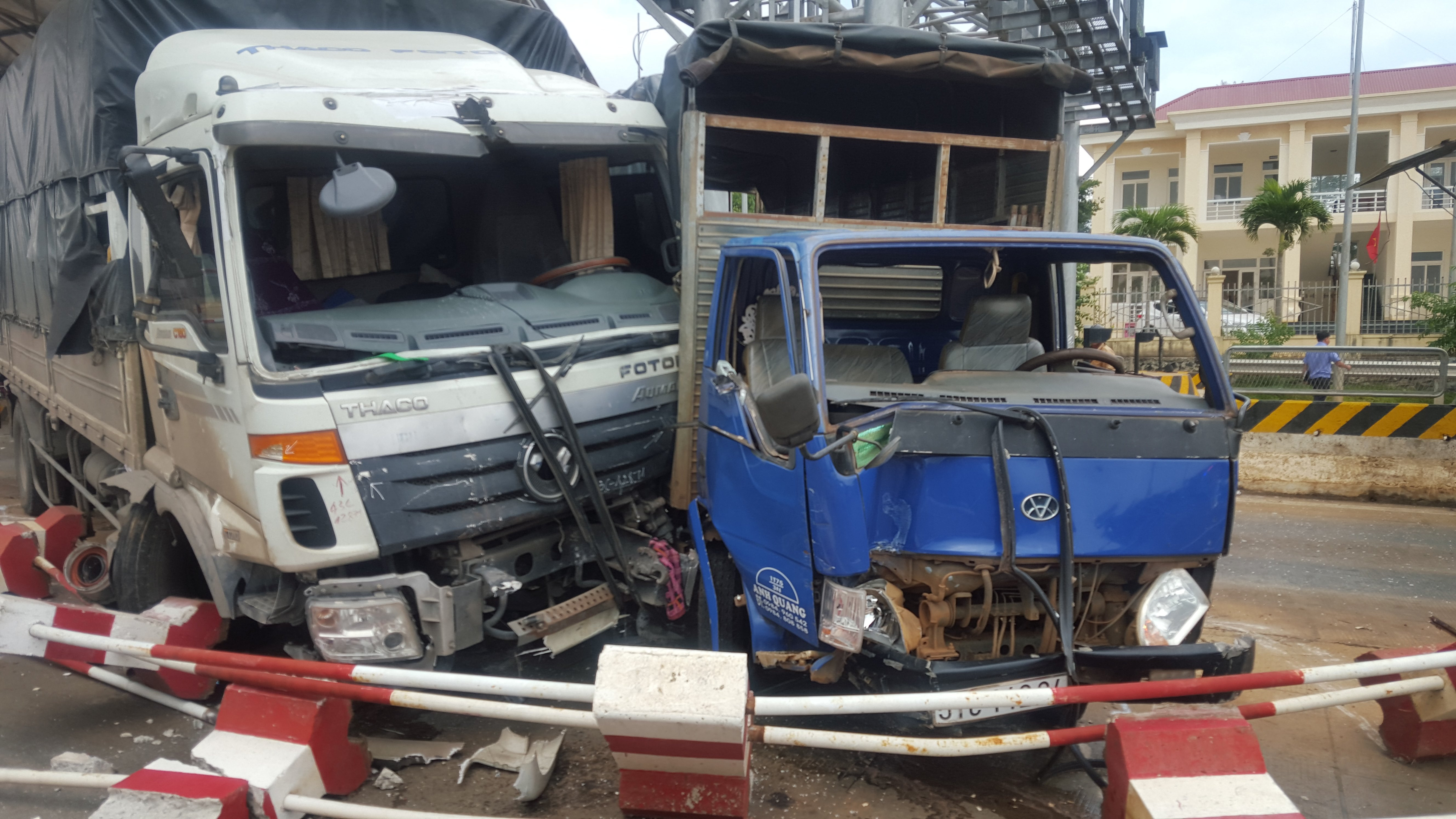 Vụ tai nạn giữa 2 xe tải xảy ra vào khoảng 8h15 ngày 30/10, tại Trạm thu phí Quang Đức, Km 1747 đường Hồ Chí Minh (đoạn qua thị xã Buôn Hồ, Đắk Lắk) khiến dải phân cách trạm BOT bị hư hỏng nặng, một tài xế bị thương.