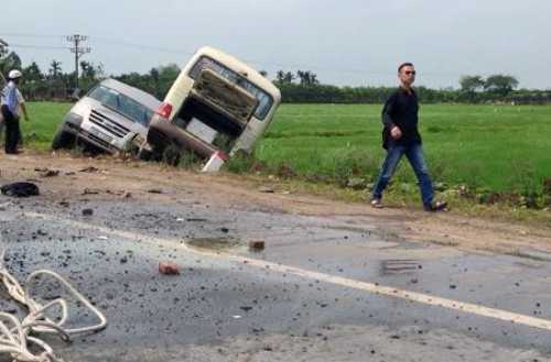 Đúng lúc này, ôtô 16 chỗ đi cùng chiều xe bồn đánh lái để tránh xe bồn thì va chạm với xe khách 29 chỗ di chuyển ngược lại. Cú va chạm mạnh khiến hai xe cùng lao xuống ruộng bên vệ đường.