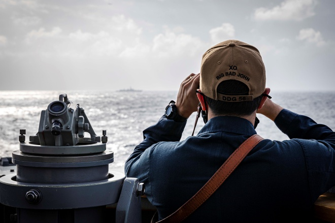 Thủy thủ tàu USS John S. McCain theo dõi một tàu nước khác khi tàu tuần tra tự do hàng hải gần quần đảo Hoàng Sa vào ngày 5/2. Ảnh: Reuters.