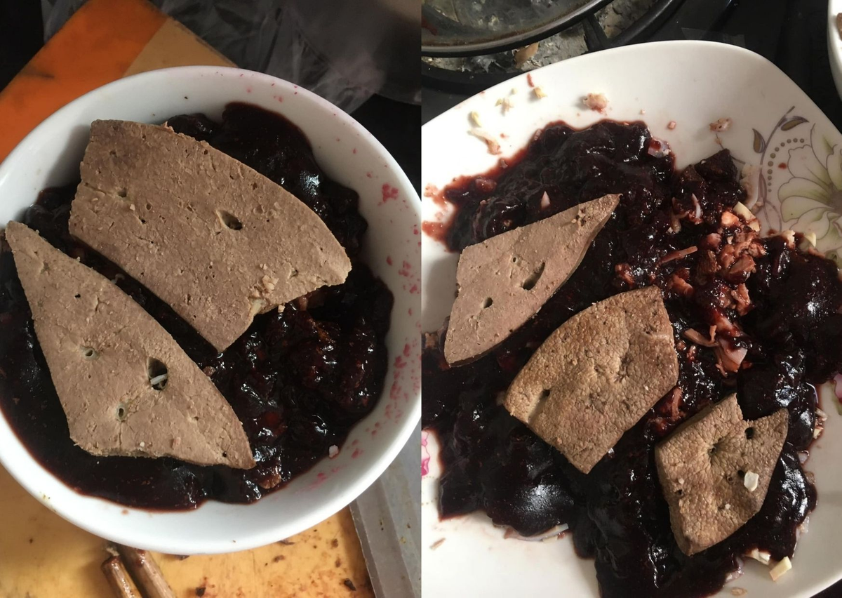 Nhưng đáng buồn là, cũng như sự cố “hàng order và hàng nhận về” khi mua đồ online, thành phẩm tiết canh healthy của cô nàng dù đã làm hệt như hướng dẫn trên mạng nhưng kết quả lại khác xa một trời một vực. Nhiều “thực khách” dù chỉ nhìn qua hình ảnh cũng thấy rùng mình ám ảnh vì quá “kinh dị”, hơn cả bản gốc làm từ tiết thật.
