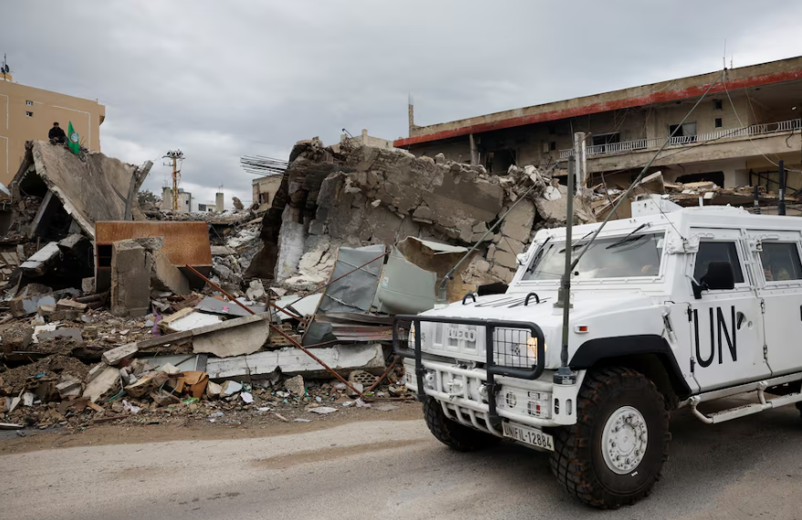 Xe của Liên hợp quốc chạy qua các tòa nhà bị phá hủy ở Lebanon sau khi lệnh ngừng bắn giữa Israel và Hezbollah có hiệu lực. (Ảnh: Reuters)