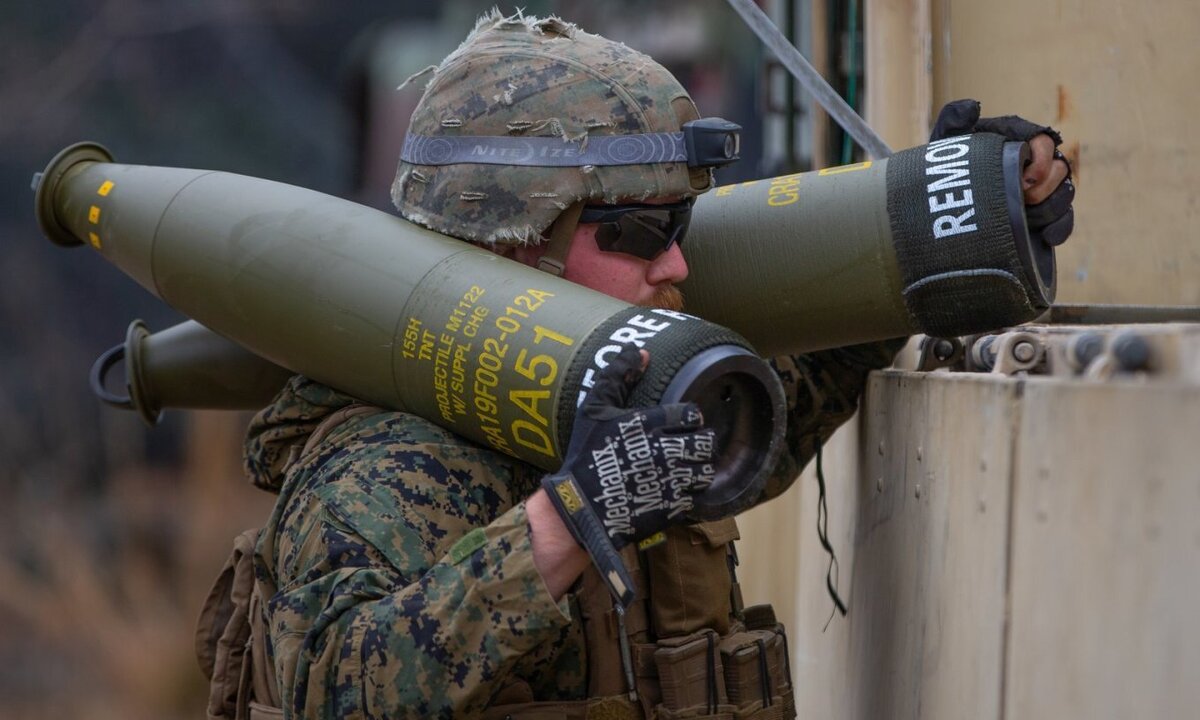 Lính Mỹ vác đạn pháo 155 mm trong một cuộc diễn tập hồi tháng 3. (Ảnh: USMC)