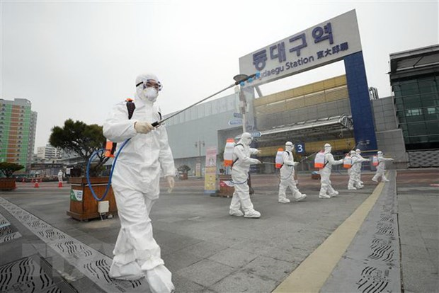 Nhân viên kiểm dịch phun thuốc khử trùng nhằm ngăn chặn sự lây lan của dịch Covid-19 tại khu vực nhà ga ở thành phố Daegu, Hàn Quốc ngày 29/2/2020. (Ảnh: Yonhap/TTXVN)