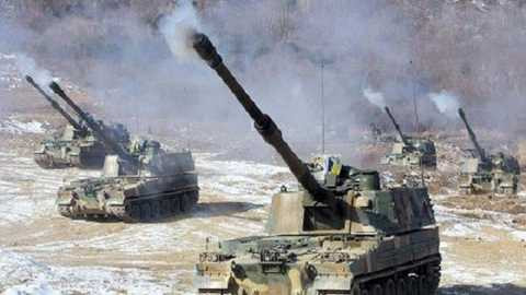 | Pháo tự hành K-9 trong một cuộc diễn tập trên đảo Yeonpyeong |