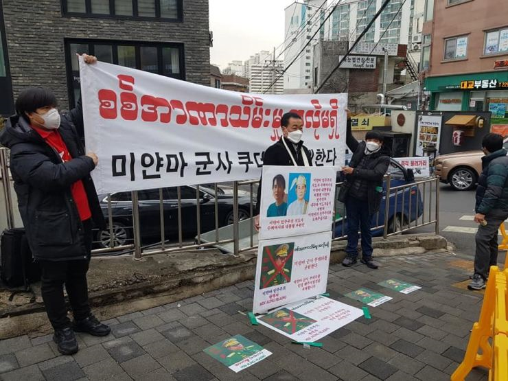 Người dân Myanmar sống ở Hàn Quốc tổ chức mít tinh phản đối cuộc đảo chính quân sự của Myanmar. (Ảnh: The Korea Times)