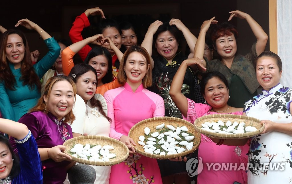 Những cô dâu ngoại quốc làm bánh gạo cho lễ Chuseok tại Gongju (Ảnh: Yonhap News)