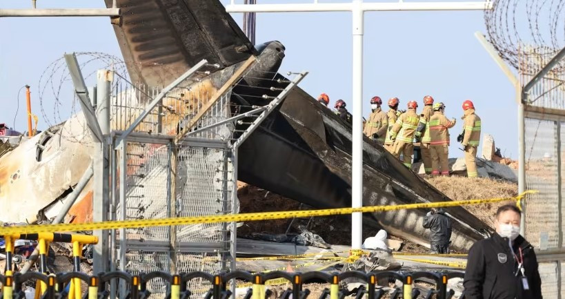 Hiện trường vụ máy bay Boeing 737-800 của hãng hàng không Jeju Air. (Ảnh: Yonhap)