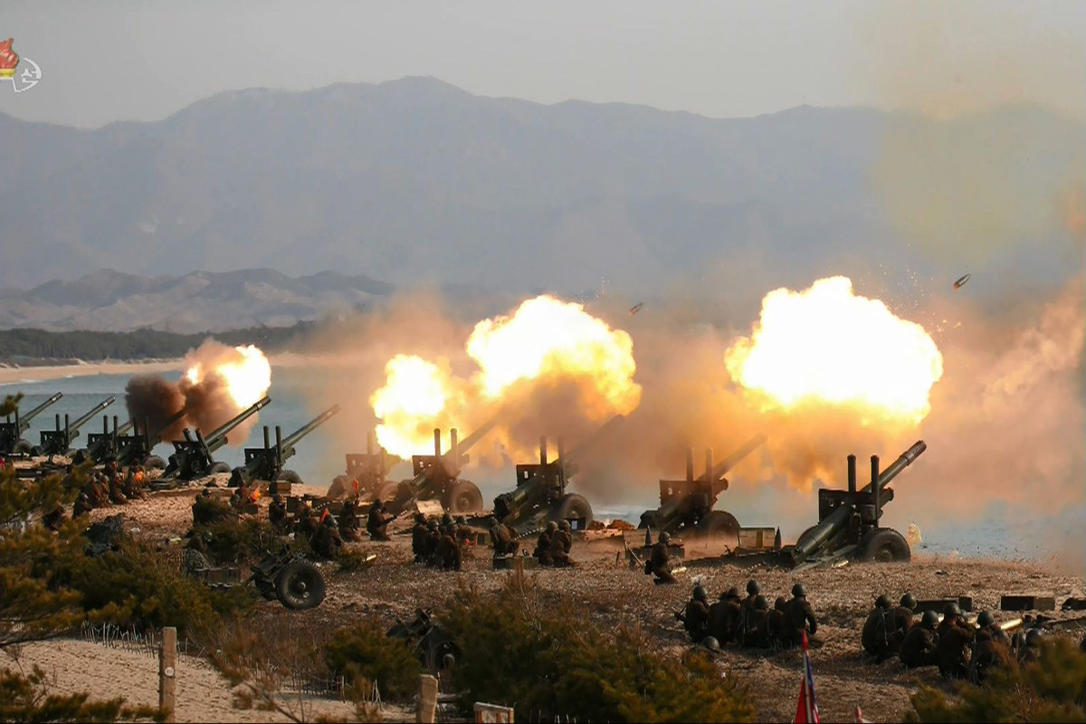 Bức ảnh do Đài truyền hình trung ương Triều Tiên công bố vào tháng 3/2020 cho thấy các đơn vị pháo binh của nước này đang bắn đạn pháo. (Nguồn: Yonhap)