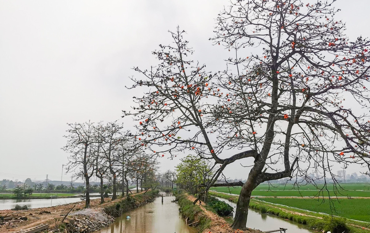 Hàng cây hoa gạo đỏ rực, rất đẹp mắt này nằm dọc theo một con kênh nhỏ giữa cánh đồng thuộc phường Tiên Nội (huyện Duy Tiên, Hà Nam) kéo dài vài trăm mét, nổi tiếng với vẻ đẹp nên thơ mỗi độ tháng Ba mùa hoa nở.