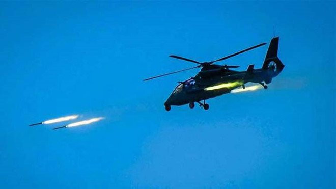 Hàng chục máy báy Trung Quốc tập trận bắn đạn thật trên Biển Đông. (Ảnh: Japan Times)