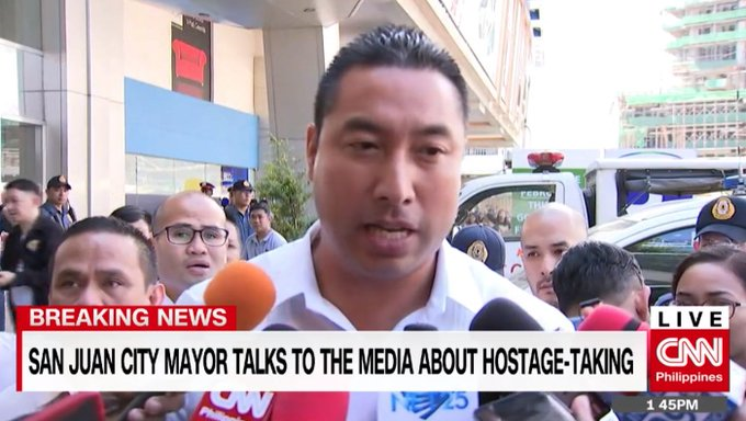 Thiếu tướng Johnson Almazan, người đứng đầu Cảnh sát khu vực phía Đông cho biết, có tiếng súng nổ tại V-Mall, khu thương mại Greenhills, thành phố San Juan khoảng trước buổi trưa. Hàng nghìn khách hàng, nhân viên bán hàng và nhân viên trung tâm đã cố gắng thoát ra ngoài.