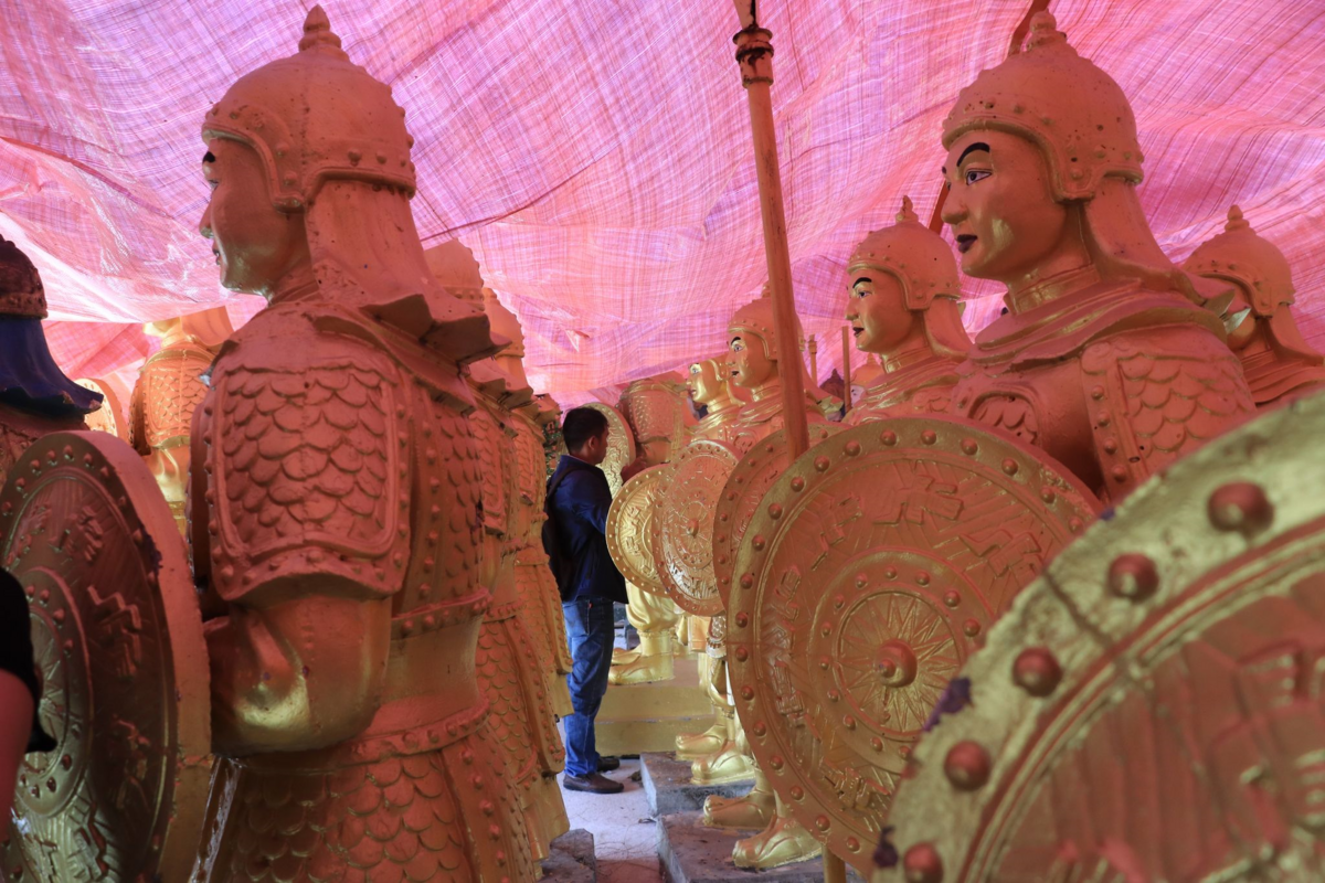Xung quanh những bức tượng là một tường thành kéo dài, công trình mô phỏng Vạn lý trường thành của Trung Quốc. Những hình ảnh này làm người ta liên tưởng đến "đội quân đất nung" có nguồn gốc ở Trung Quốc.
