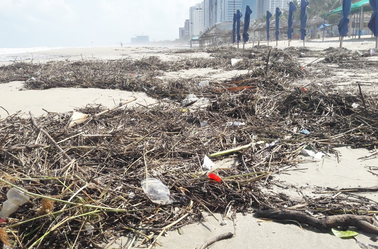 Theo ghi nhận của phóng viên ngày 17/10, đoạn bờ biển dài khoảng 5km từ Công viên Biển Đông đến cửa xả Mỹ An phủ đầy rác do bị sóng đánh dạt.