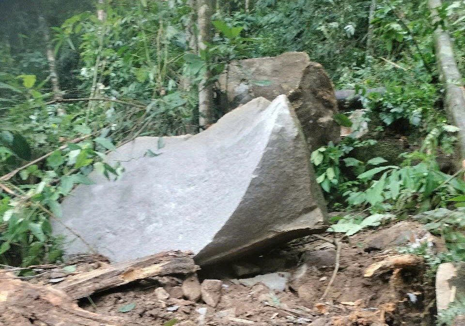 Những tảng đá lớn lăn từ trên đỉnh núi Ngọc Mong xuống khiến cây cối gãy đổ. (Ảnh: T.D)