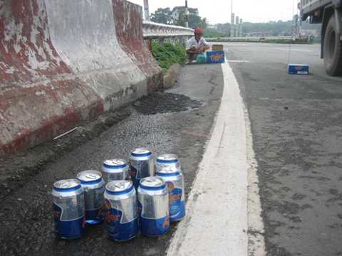 Chỉ trong khoảng gần 30 phút, toàn bộ số bia bị rơi đã được chuyển lên xe nguyên vẹn, chỉ còn rơi lại số ít bia bị móp méo do bị rơi rớt.
