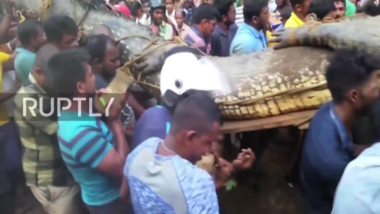 Sau khi xuất hiện trong vườn chè và bị dân làng vây bắt, con cá sấu khổng lồ dài 5,2m được đưa tới khu bảo tồn động vật hoang dã địa phương ở thị trấn Akuressa, Sri Lanka.