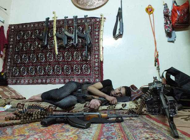 | Một phiến quân Syria nhóm Khaled ibin al Walid tại trung tâm Homs nằm ngủ bên cạnh vũ khí |