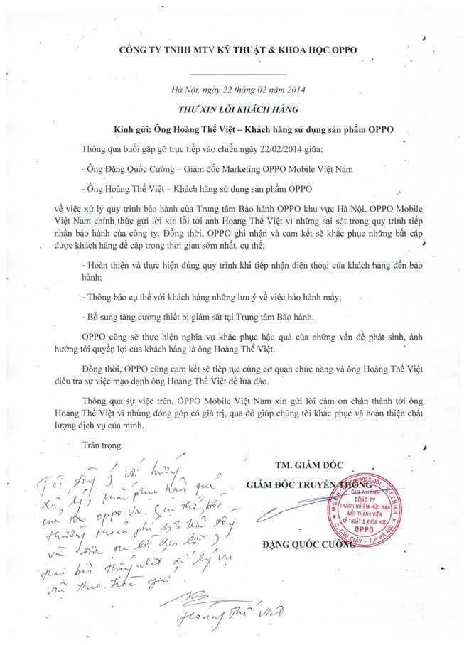 Thư xin lỗi khách hàng của Oppo Việt Nam.