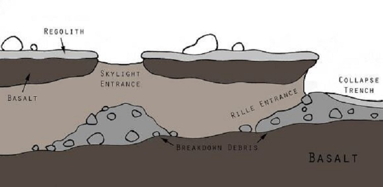 Hình ảnh mô phỏng mặt cắt ngang của một hố dung nham trên sao Hỏa. (Ảnh: RT)