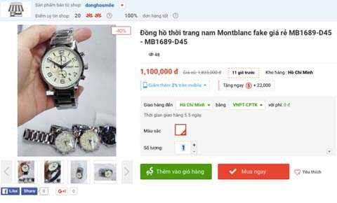 Trong các tin rao bán của cửa hàng có tên donghosmile trên Sendo, nhiều mẫu đồng hồ Mont Blanc được ghi là fake hoặc super fake và bán với giá khá rẻ, 1.100.000 đồng được áp dụng cho nhiều mẫu khác nhau.