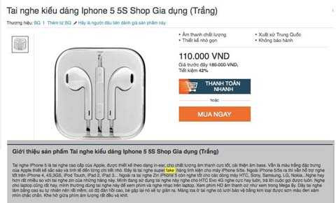Cụ thể trên trang Lazada, một nhà cung cấp tên BQ Việt Nam bán chiếc tai nghe kiểu dáng iPhone 5 5S với giá 110.000 đồng, và tự nhận đây là sản phẩm super fake – làm nhái theo hàng chính hãng.