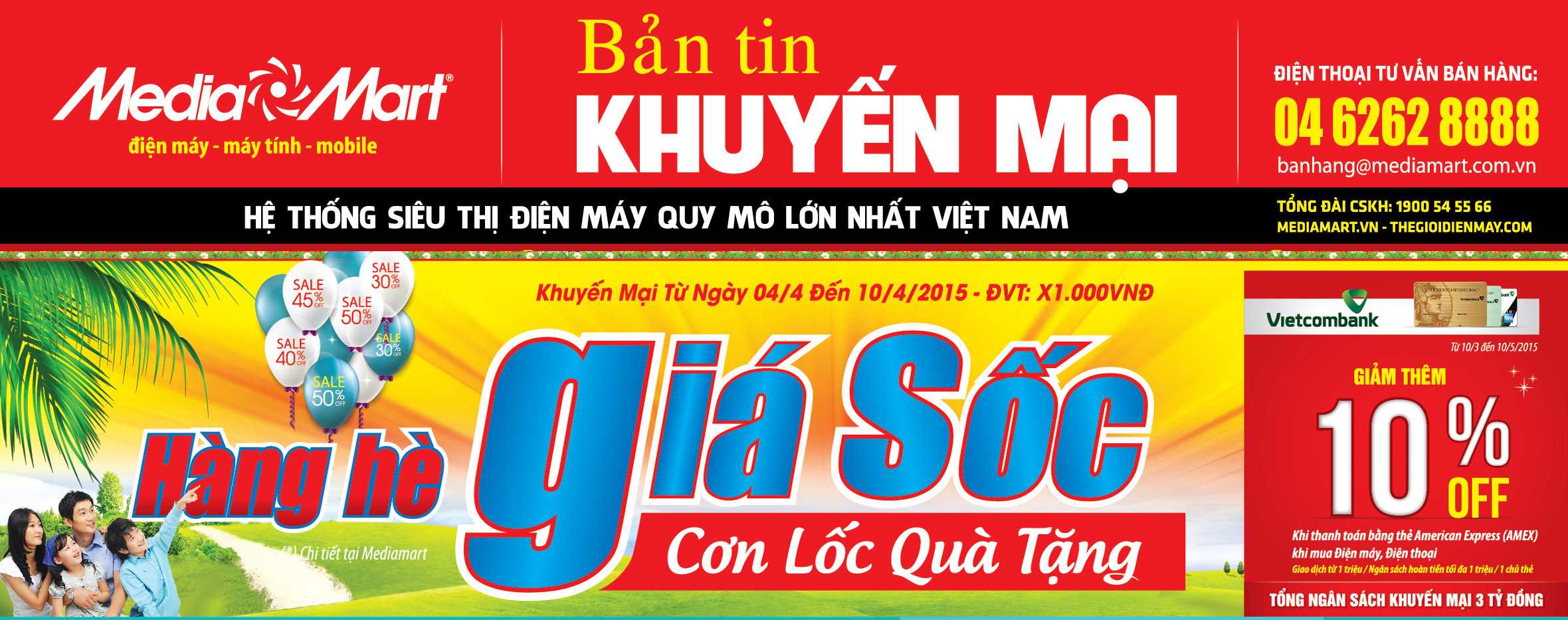Đặc biệt, nhằm giúp khách hàng có cơ hội dùng thử, trải nghiệm sản phảm trước khi quyết định mua sắm, MediaMart cho mượn miễn phí 2000 quạt phun sương Kangaroo KG56S. Sản phẩm đang có giá hãng công bố là 2.800.000đ, khách hàng sau thời gian dùng thử có thể trả lại sản phẩm hoặc nếu ưng ý muốn mua sản phẩm sẽ chỉ cần thanh toán với giá là 1.990.000đNgoài các sản phẩm giải nhiệt, phục vụ sức khỏe của mọi người trong mùa hè nóng nực cũng khá phong phú và đang được ưu đãi lớn: máy xay sinh tố Philips HR2100 giảm 38% còn 549.000 đồng, máy xay cầm tay Philips HR1600 giá sốc 699.000đ, nồi cơm điện 1.8l Sharp KS-181ETV’’SL’’ và Panasonic SR-TEJ18HLRA đồng giá 899.000đ…Song song với “Hàng hè giá sốc” là các sản phẩm máy giặt, tủ lạnh giảm giá đến 50%, cam kết giá rẻ nhất thị trường như: tủ lạnh 2 cánh Sharp 180l SJ-172E-SS giá chỉ 4.790.000đ, máy giặt Panasonic 7.0kg NA-F70VB6HRV giảm 20% còn 3.890.000đ tặng quà.... Đây cũng là thời điểm vàng để sở hữu ngay loạt TV với giá đáy. Ngay từ bây giờ, tại Media Mart, khi mua TV LED khách hàng được tặng ngay phần quà trị giá đến 1.290.000đ gồm lò vi sóng, bình siêu tốc hay quạt Midea cao cấp. Cùng với đó là nhiều model TV đang được ưa chuộng được giảm giá sâu như: LED 32’’ Toshiba 32P2400 chỉ 4.490.000đ, LED 40’’ 40L2450 giảm 1,9 triệu còn 6.490.000đ, SmartTV 3D 55’’ Samsung 55H6400 giảm 6,9tr còn 19.990.000đ…Cũng trong đợt này, các tín đồ công nghệ có cơ hội sở hữu Smartphone mới ra mắt 2015 với giá siêu sốc: Samsung Galaxy S6 đã có mặt tại MediaMart với giá 16.588.000đ tặng quà khủng. Nokia 630 giá 2.388.000đ, iPhone 5S giảm 2 triệu còn 2.988.000đ..Tháng 4 –tháng siêu khuyến mại laptop với HP Stream 13-C001TU giảm 3 triệu đồng còn 3.990.000đ, Lenovo core i3 – 4005U giảm 2 triệu còn 6.990.000đ, Asus P450LDV-W0193D core i5 giá 10.990.000đ. Khi mua laptop tại Media Mart khách hàng được tặng thêm quạt cây trị giá 450.000 đồng…Giảm tối đa các chi phí không cần thiết, cắt giảm lợi nhuận để giảm giá thành nhưng vẫn phải đảm bảo chất lượng sản phẩm, đó là uy tín của các doanh nghiệp lớn. Đặc biệt, không chỉ giảm giá kích cầu, những Hệ thống siêu thị điện máy như Media Mart còn không ngừng gia tăng các dịch vụ hậu mãi, bảo hành.