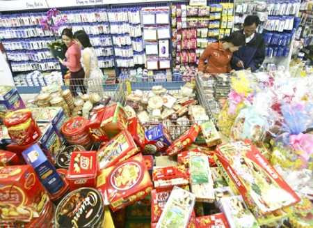 Hàng hóa rượu, bia, bánh, mứt kẹo ngoại vẫn được người dân thành thị ưu ái hơn so hàng hóa nội do giá cả chênh lệch không lớn. Giá hàng hóa của các nhãn hàng trong nước so với cùng kỳ Tết năm trước đã tăng khoảng 15-25% (tùy loại) nhưng mức tăng chủ yếu được điều chỉnh từ trong năm do các chi phí đầu vào sản xuất tăng.