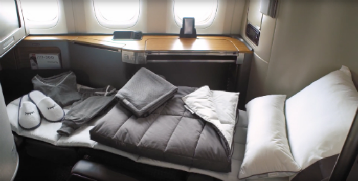 Bộ ga gối, chăn, quần áo ngủ cùng dép đi trong nhà của khoang hạng nhất. Ảnh: American Airlines.