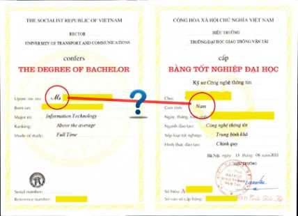 Đặc biệt hơn, khi cầm tấm bằng trên tay thì rất nhiều sinh viên đã ngỡ ngàng vì bằng in sai giới tính. Theo phản ánh của các sinh viên này đã có sự sai lệch về giới tính khi in trên bằng khi phần chữ tiếng anh ghi Ms trong khi đó bên Tiếng Việt tương ứng lại là Nam.